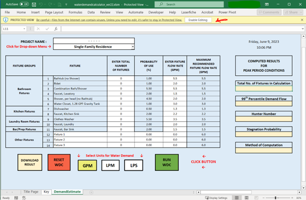 Although care has been taken to ensure the accuracy, completeness and reliability of the Water Demand Calculator (“Calculator”), neither IAPMO nor any other party makes any warranties, express or implied, or representations as to the accuracy of the Calculator. Neither IAPMO nor any other party assumes any liability or responsibility for any error or omissions in the information contained in or output by the Calculator. Neither IAPMO nor any other party assumes any responsibility for the consequences of use of such information, nor for any infringement of third party intellectual property rights which may result from its use.