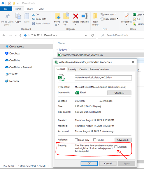 The Water Demand Calculator requires a compatible version of Excel 2009 or later to prevent loss of functionality as it uses active content (macros). For security reasons, the Microsoft Office has security features that disables the macros with a warning message. The message advises the user that active content has been detected. This does not mean that viruses have been detected. The source file comes from IAPMO, so the file can be trusted, and the macros can be enabled. Once the file is trusted, the warning will no longer appear. You may also need to check with your company's system's administrator for security permission to download a file with macros.